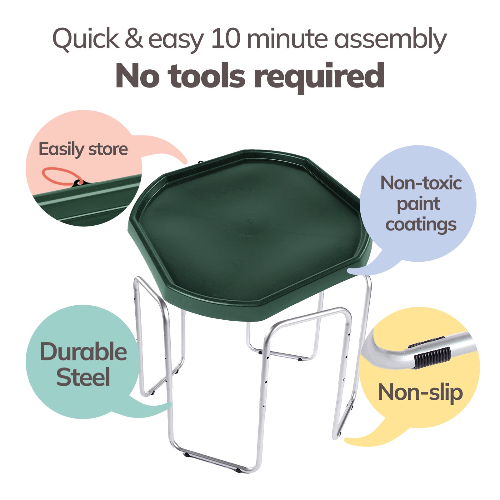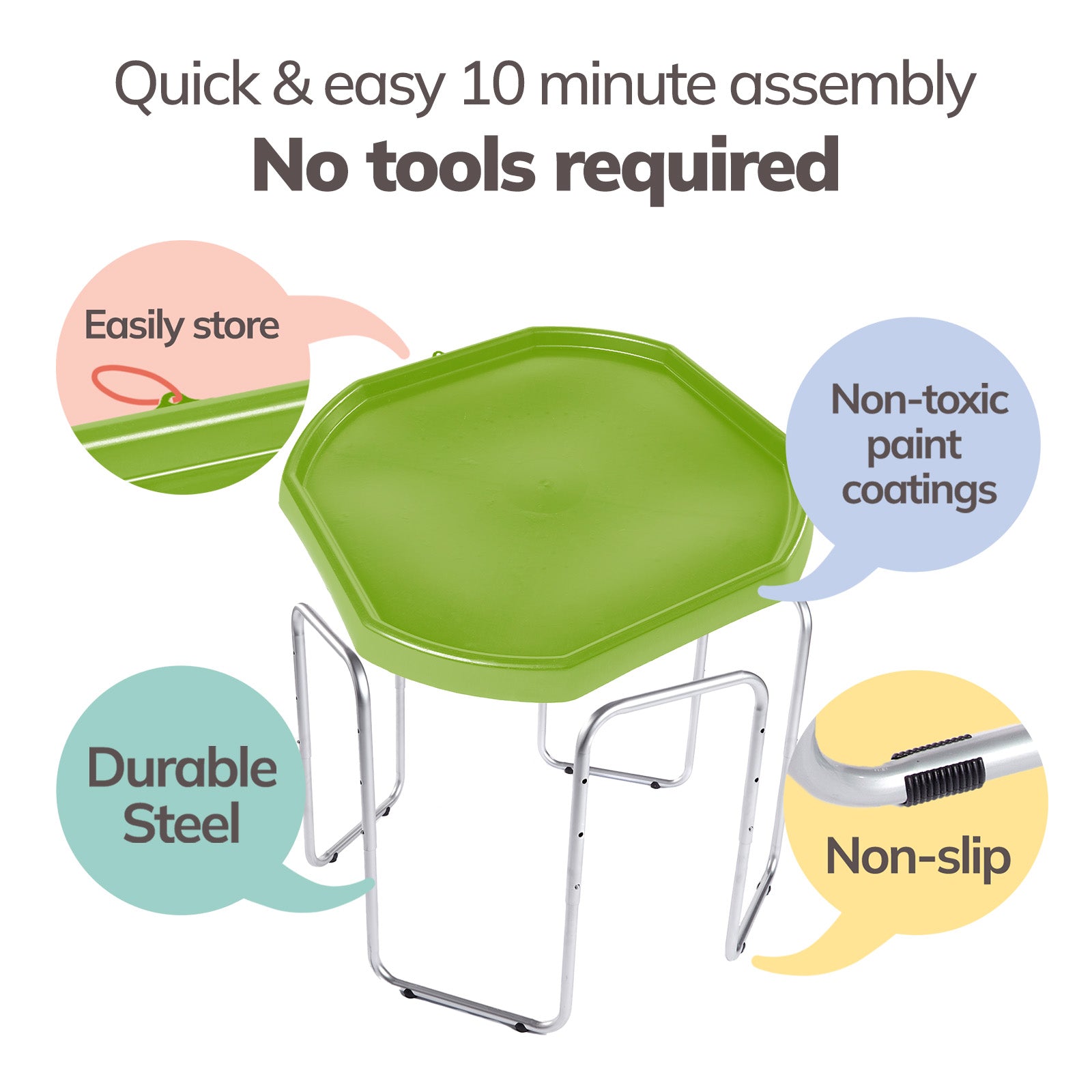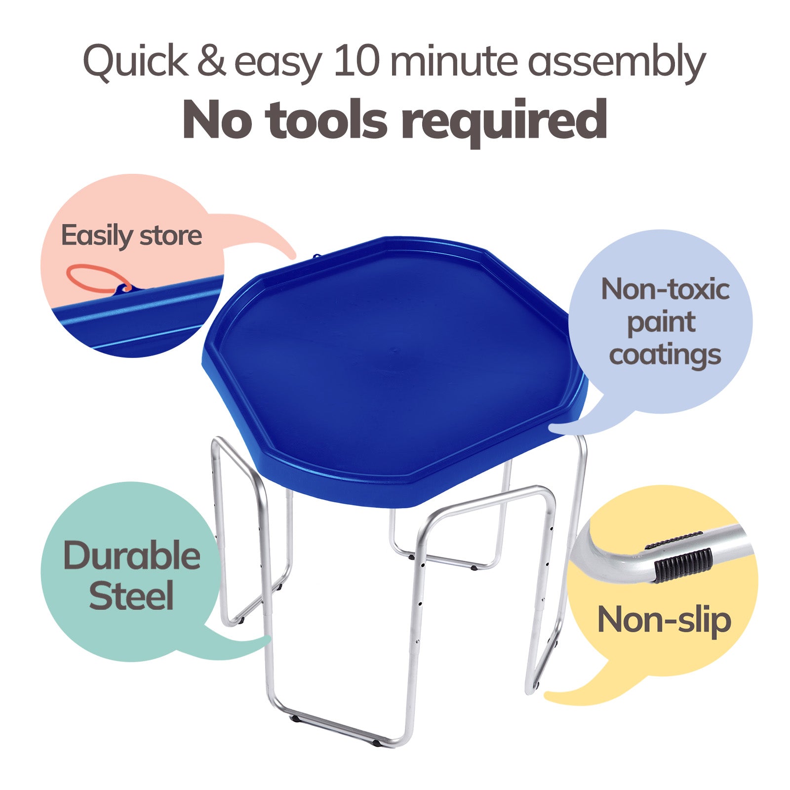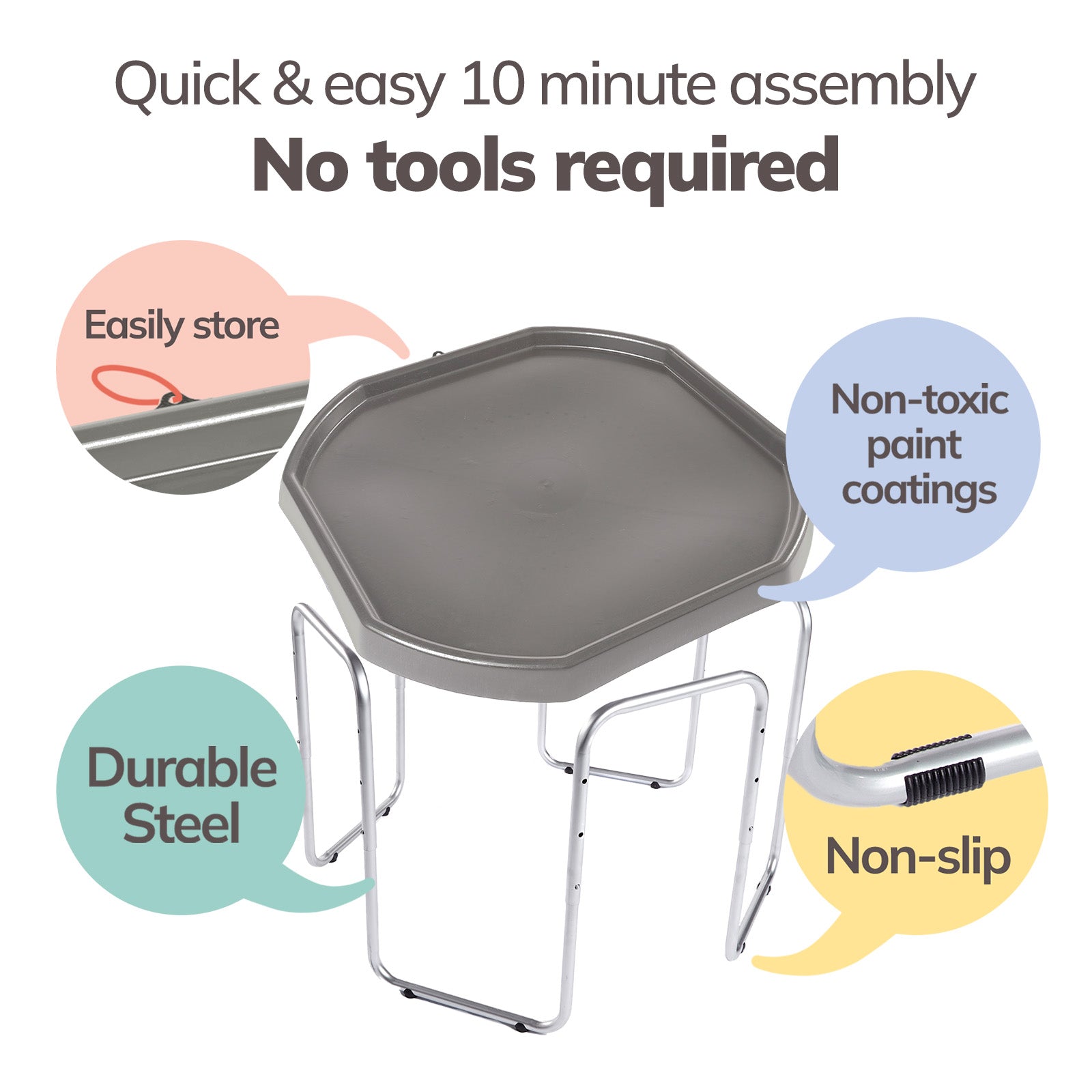 The Tuff Tray Set includes the tray and 3-position adjustable height stand. For added fun, accessories can be purchased separately here.