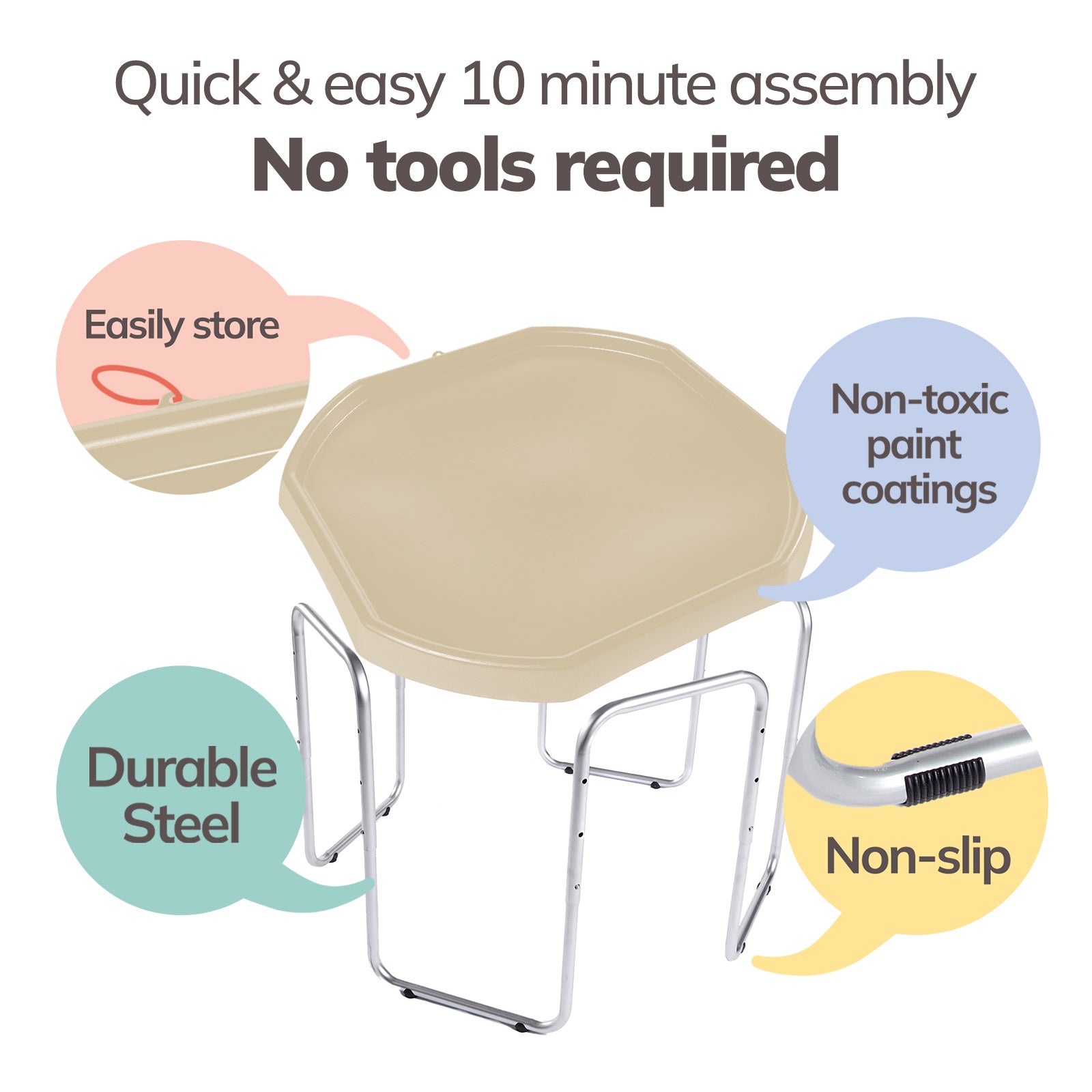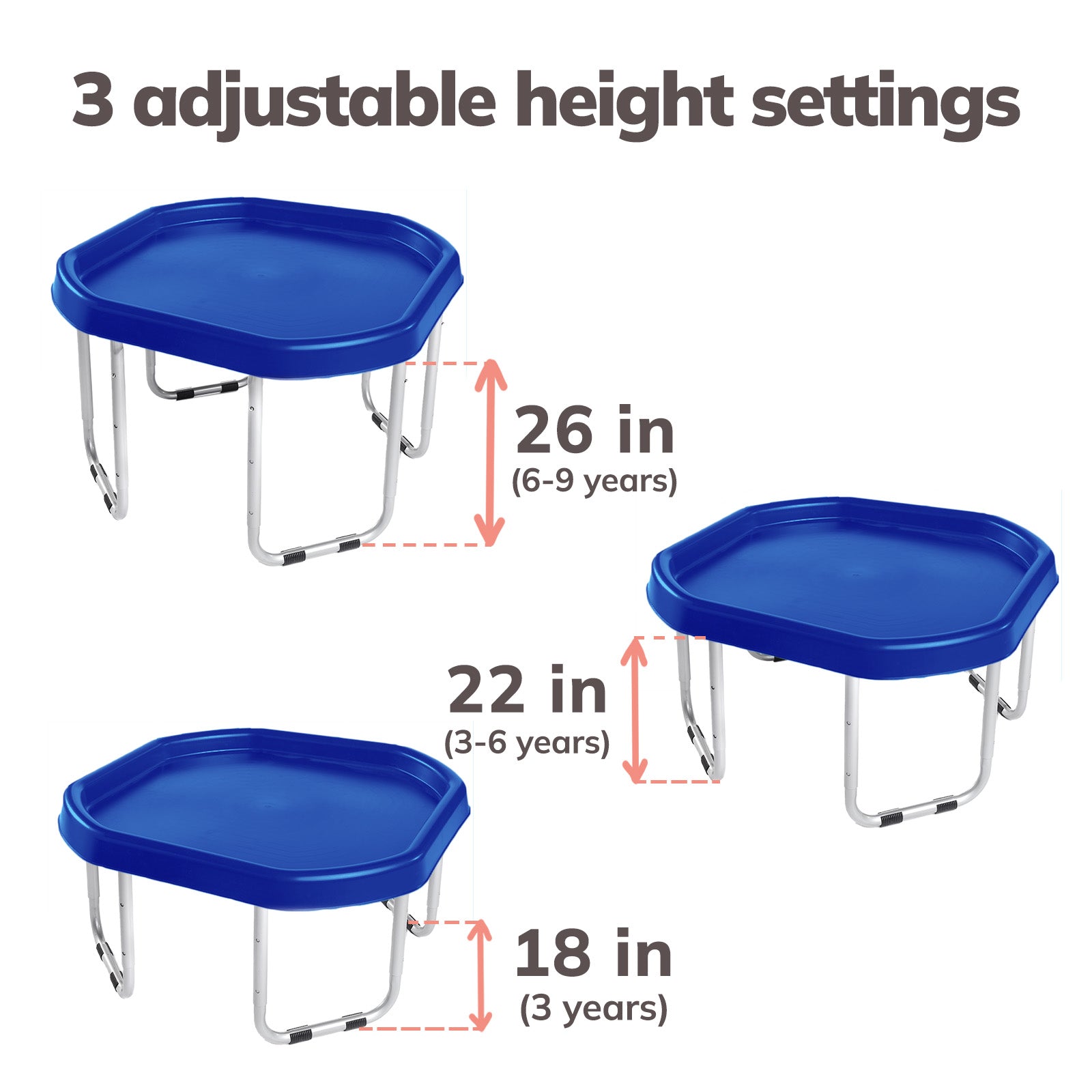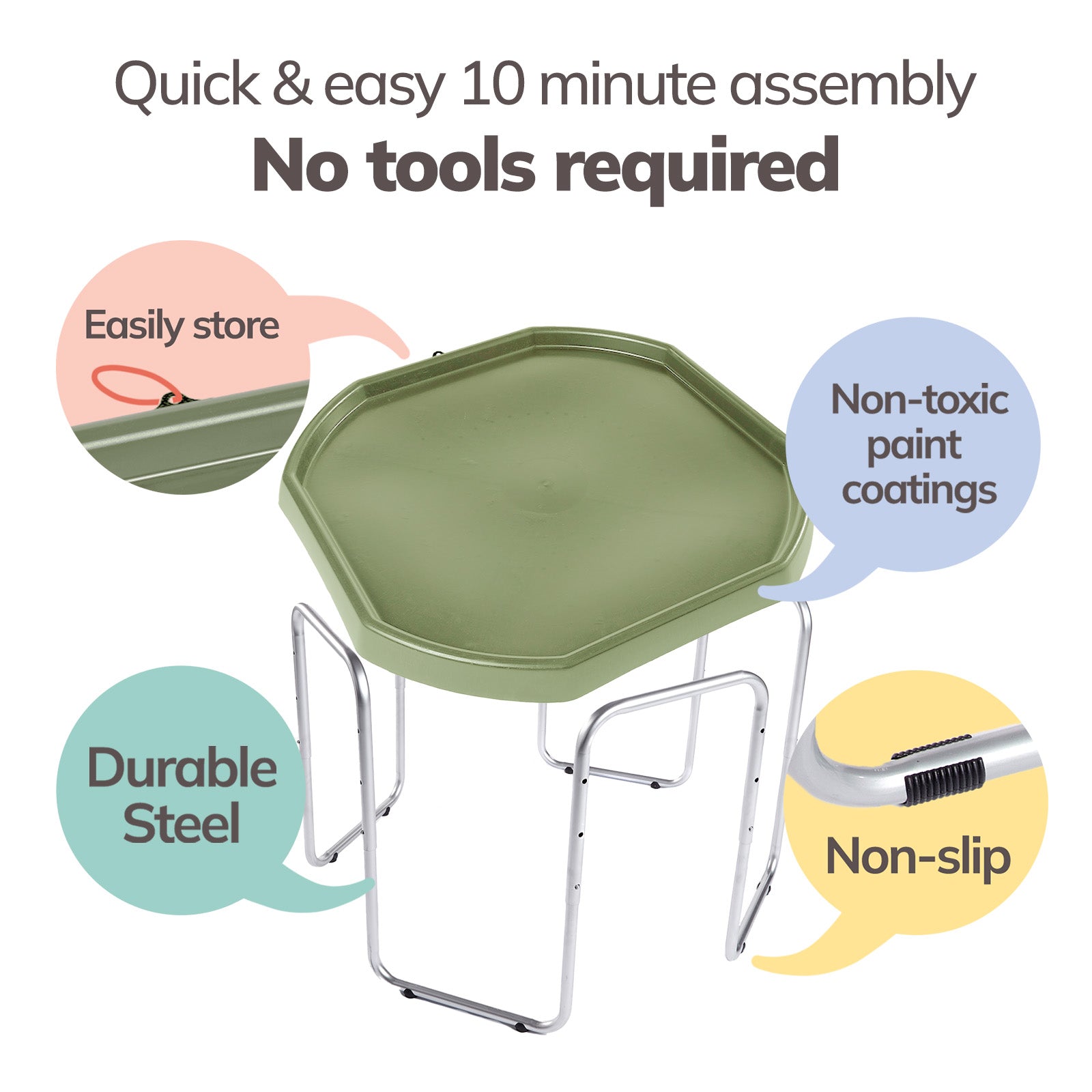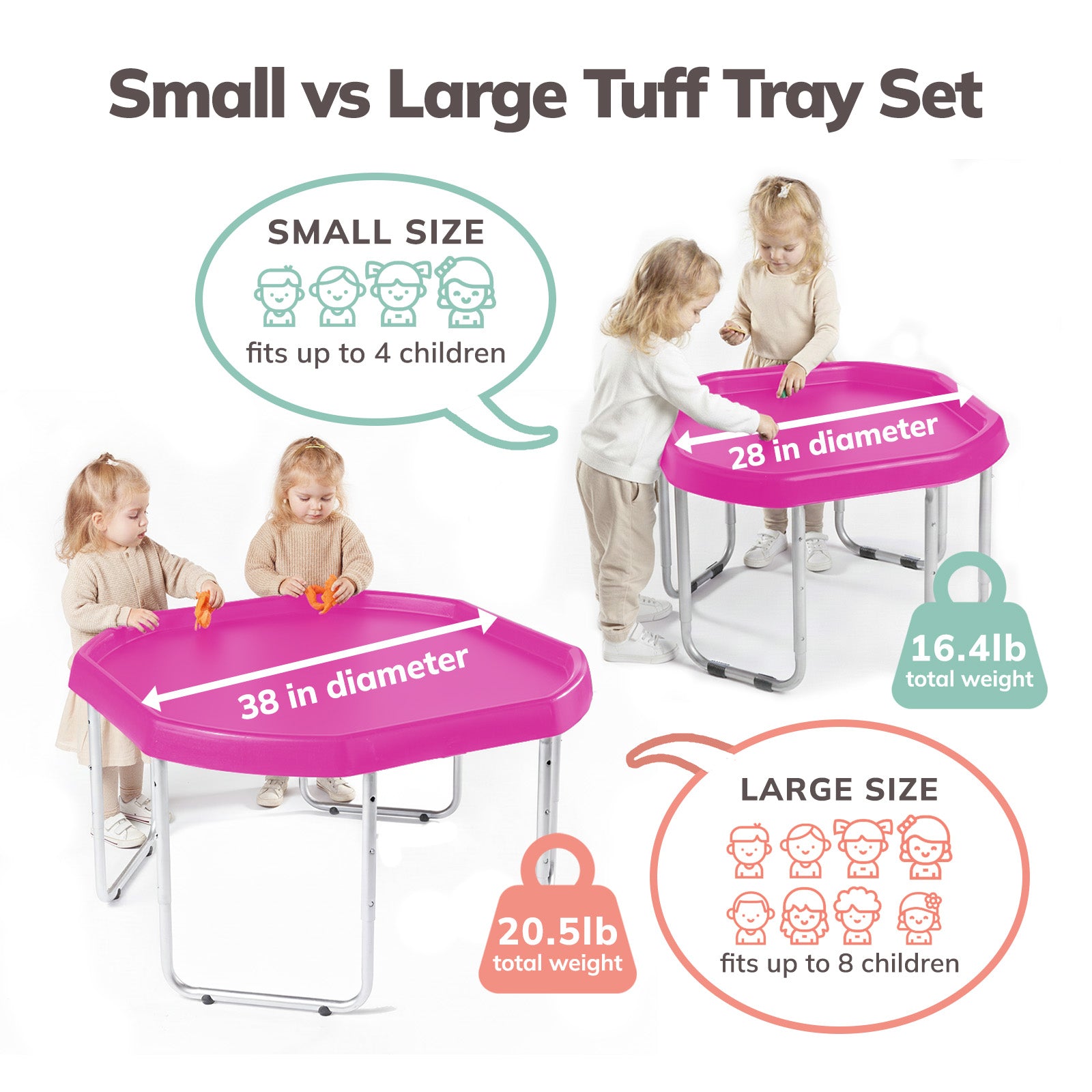 The Tuff Tray Set includes the tray and 3-position adjustable height stand. For added fun, accessories can be purchased separately here.