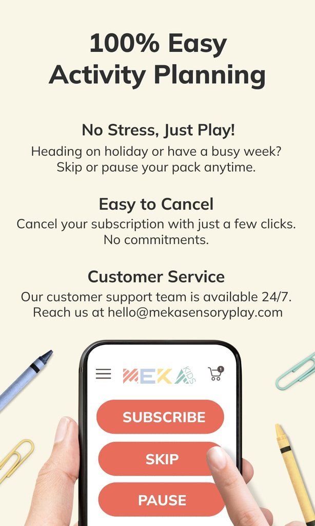 Yes, you can cancel your subscription anytime. If you're facing any issues, please contact MEKA's customer service at hello@mekasensoryplay.com